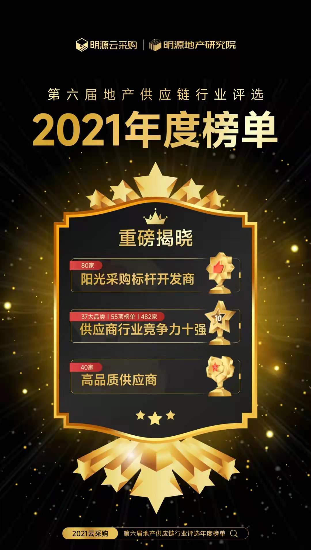 據悉,此次年度榜單內容涵蓋2021年度中國房地產供應商行業競爭力十強、陽光采購標桿開發商、高品質供應商三大榜單!這是明源云采購基于平臺3800+家入駐開發商根據真實合作經歷、親自參與評選出的榜單。