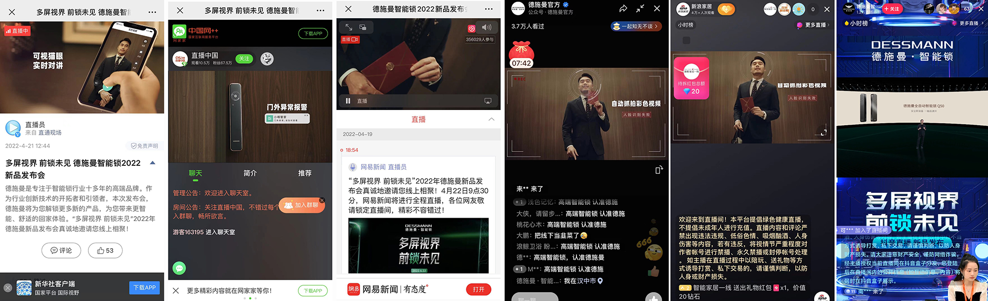 4月22日,以“2022硬剛PLUS”為主題的德施曼年度峰會在線隆重舉行。新華社、中國網++、新浪微博、今日頭條、網易新聞等視頻直播平臺以及騰訊視頻號、抖音、天貓、京東等平臺官方賬號同步直播。德施曼總裁祝志凌、執行總裁李修平攜手經緯創投合伙人肖敏等多方代表,從不同角度解讀智能鎖行業發展變化,共同探尋2022年德施曼及智能鎖產業的新動力。同時現場重磅發布了7款全面引領高端市場的年度新品,憑借“更進一步”的技術創新和高端體驗,一經發布便成為了廣大媒體和用戶關注的焦點。