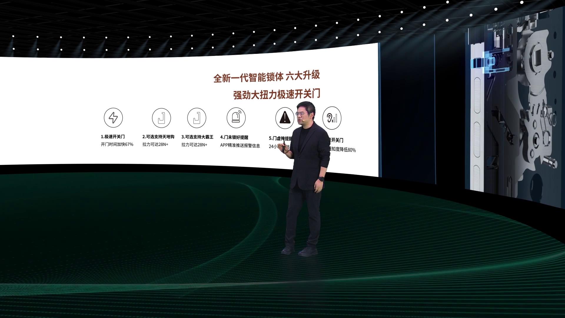 其次,首創全新一代智能鎖體。融合了機械鎖體和電子鎖體的優勢,不僅有虛掩提醒等功能,更擁有強勁大扭力可極速開關門,還能帶動天地鉤,適配性更高。