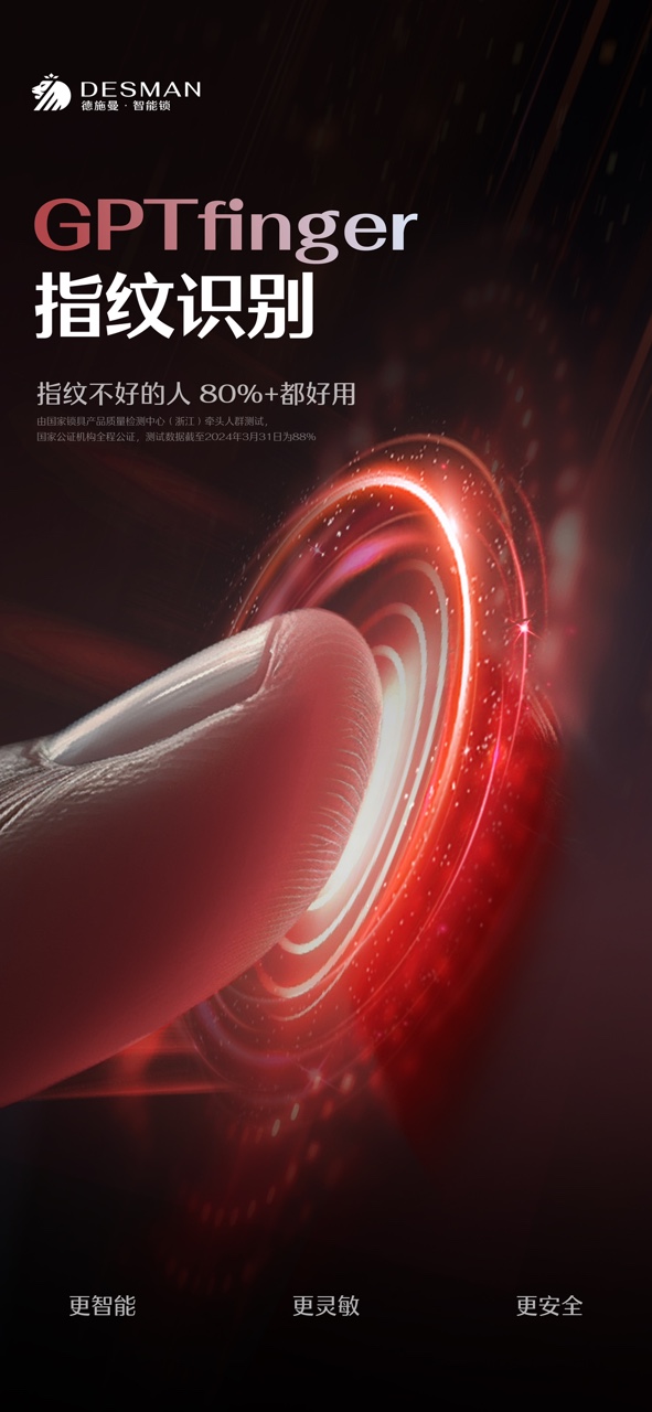 經(jīng)國(guó)家鎖具產(chǎn)品質(zhì)量檢測(cè)中心(浙江)牽頭人群測(cè)試,國(guó)家公證機(jī)構(gòu)全程公證,德施曼GPTfinger,指紋不好的人,80%+都好用。