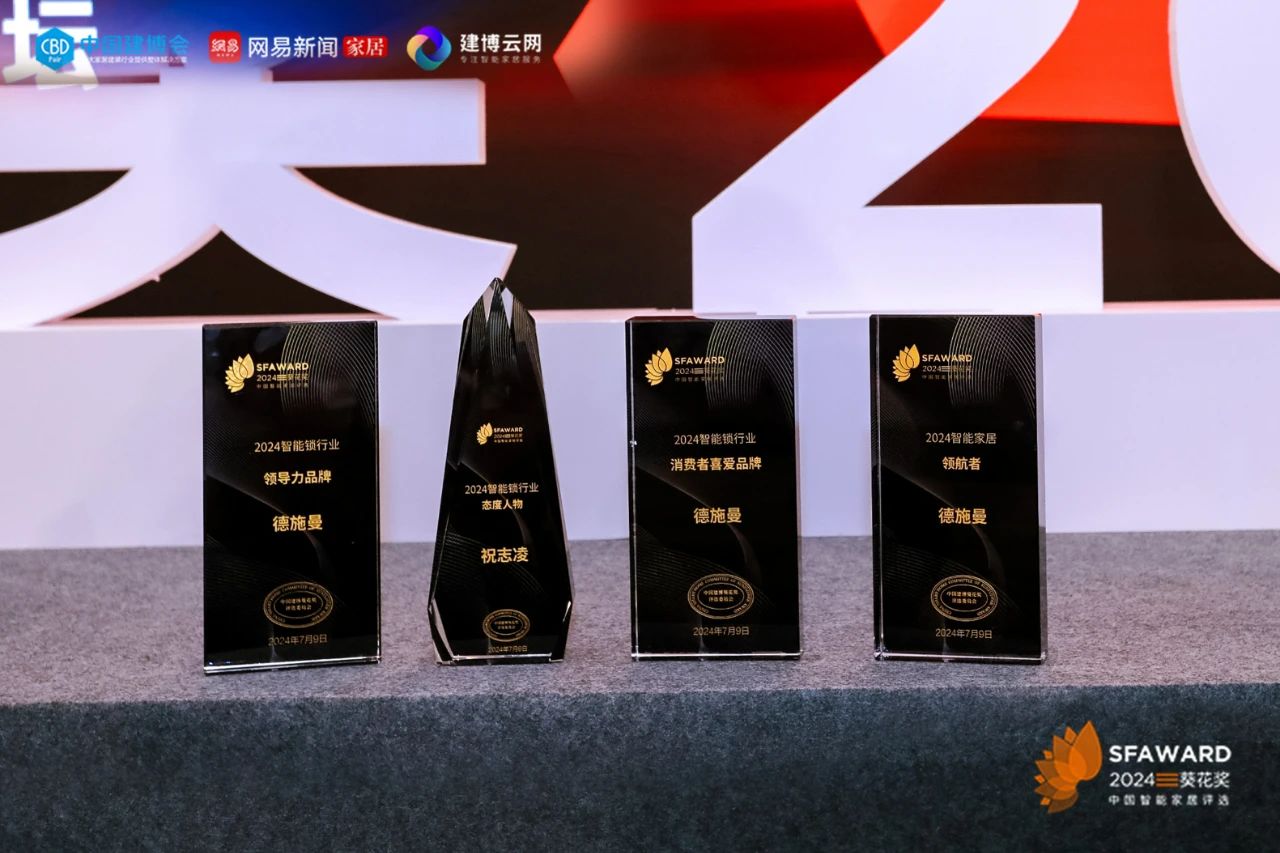 德施曼智能鎖一舉斬獲2024葵花獎“智能鎖行業消費者喜愛品牌”、“智能鎖行業領導力品牌”“智能家居領航者”大獎;